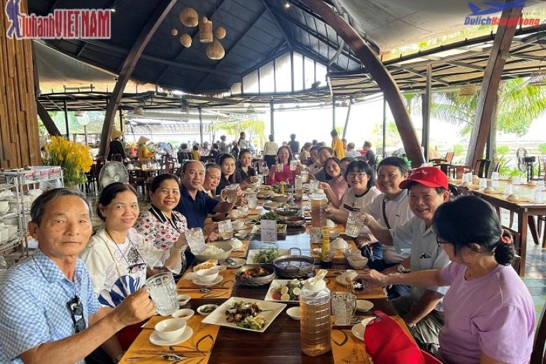 Dùng cơm trưa tại nhà hàng trên Cồn Sơn với các món ăn đậm chất Miền tây như Bánh xèo miền tây, gỏi bong điên điển + lẩu cá lốc bông súng.