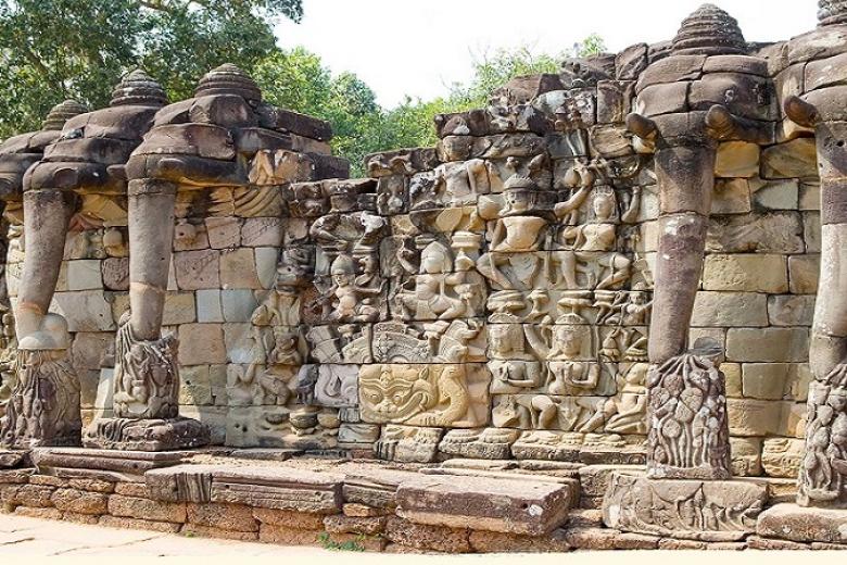 Điểm gây ấn tượng mạnh mẽ nhất tại Quảng Trường Đấu Voi là bức tường đá dài hơn 300 mét, được chạm khắc tinh xảo hình ảnh những đàn voi dũng mãnh đang diễu hành, kèm theo các chiến binh, vũ công và thần thoại Khmer. Những chiếc vòi voi vươn dài bằng đá cùng các tượng voi bán thân nhô ra từ tường như tái hiện sống động một thời vàng son của đế chế Angkor. Đây cũng là nơi các vị vua đứng quan sát các sự kiện lớn diễn ra trong quảng trường phía trước.
