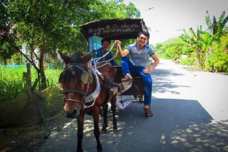 Sau đó lên tàu sang Bến Tre. Đến Quê Dừa Bến Tre quý khách tham quan lò sản xuất kẹo dừa, lò bánh tráng, lò cốm, lò nấu rượu...Tại đây quý khách xem mô hình sản xuất và trực tiếp thưởng thức sản phẩm. Quý khách trải nghiệm đi xe ngựa trên đường làng quen thuộc hồi tưởng lại miền ký ức xưa... Sau đó quý khách ra bến tàu đi đò chèo trên con rạch đẹp nhất Tân Phú Bến Tre với thời lượng 20 phút dưới những rặng bần, dừa nước rợp mát đẹp mắt ngắm cảnh sông nước miền tây hữu tình, đích thực với những vườn trái trái cây trĩu quả như sầu riêng, chôm chôm, măng cụt (tho mùa)...Sau đó tiếp tục đến nhà hàng sinh thái miệt vườn bên bờ sông, quý khách dùng bữa trưa với các món đặc sản đậm chất miền tây, nghỉ ngơi thư giãn tại khu du lịch sinh thái miệt vườn Bến Tre.