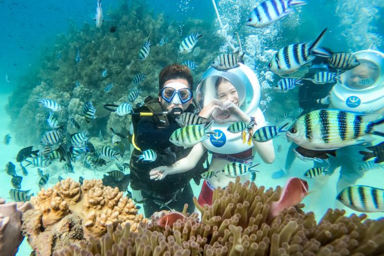 Bắt đầu với chương trình Đi bộ dưới đáy biển, ngắm nhìn những rạng san hô và những chú cá đa dạng màu sắc và chụp những bức hình/quay những video clip về làm kỉ niệm, sống ảo. (Chi phí tự túc)