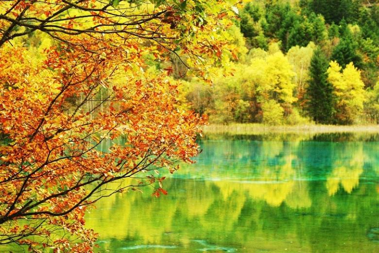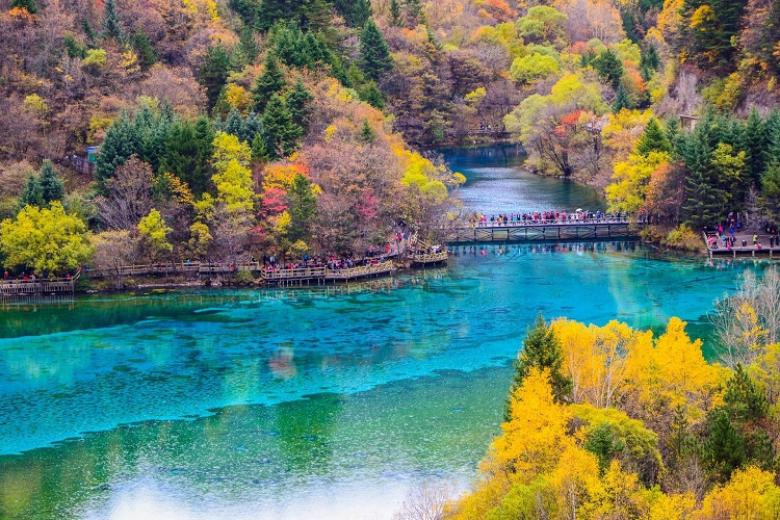 Một trong những điểm tham quan nổi bật nhất tại Cửu Trại Câu chính là Hồ Ngũ Sắc. Hồ có đặc điểm độc đáo là màu nước thay đổi theo mùa, tạo nên cảnh sắc kỳ ảo. Màu vàng, xanh lục, xanh lam của hồ nước phản chiếu qua lớp trầm tích đá vôi dưới lòng hồ, khiến mặt nước lấp lánh như một bức tranh thiên nhiên sống động. Dù vào mùa xuân khi cây cối đâm chồi, mùa hè xanh tươi, hay mùa thu rực rỡ sắc màu lá, Hồ Ngũ Sắc luôn mang đến những trải nghiệm mãn nhãn ấn tượng.