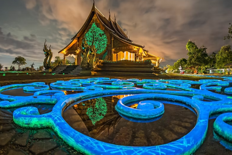 Wat Sirindhorn Wararam Phurao, nằm ở tỉnh Ubon Ratchathani, Đông Bắc Thái Lan, là ngôi chùa nổi tiếng với cây phát sáng huỳnh quang, tạo nên khung cảnh huyền ảo vào ban đêm. Được thiết kế lấy cảm hứng từ nghệ thuật Phật giáo, chùa mang đến trải nghiệm tâm linh độc đáo. Tham quan vào buổi tối để chiêm ngưỡng ánh sáng rực rỡ và không gian thanh tịnh, nơi đây là điểm check-in lý tưởng, thu hút du khách quốc tế và tín đồ yêu nghệ thuật.