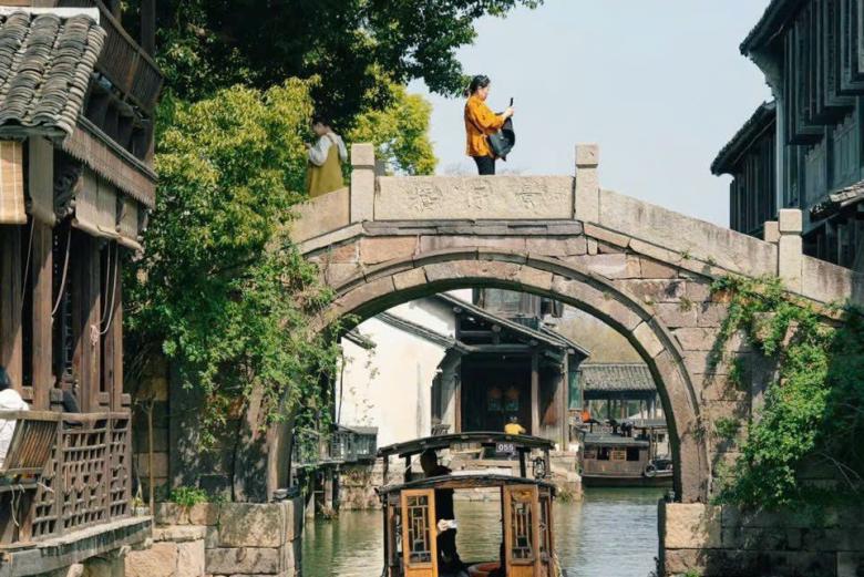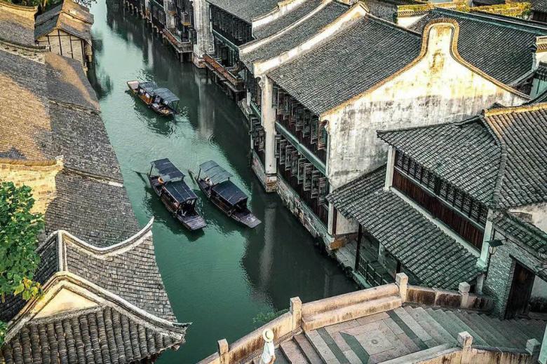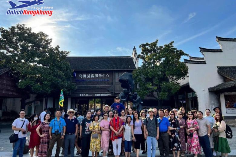 Sau đó đoàn khởi hành đi Ô Trấn - là một trong sáu thị trấn cổ nổi tiếng nhất vùng Giang Nam, được mệnh danh là “Venice của phương Đông”. Với hơn một nghìn năm lịch sử, Ô Trấn giữ nguyên vẻ đẹp cổ kính của những con đường lát đá, mái ngói rêu phong và dòng kênh xanh biếc len lỏi quanh làng. Những cây cầu đá cong cong, ngôi nhà gỗ cổ kính soi bóng xuống mặt nước tĩnh lặng tạo nên khung cảnh trữ tình, nên thơ. Đến Ô Trấn, du khách như được quay ngược dòng thời gian, hòa mình vào nhịp sống yên bình, thưởng ngoạn cảnh quan sông nước hữu tình và khám phá nét văn hóa đặc sắc của vùng Giang Nam trầm mặc.