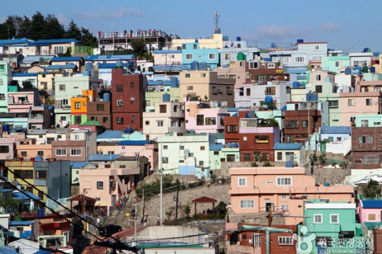 Làng Gamcheon được ví như “Santorini của Hàn Quốc” bởi lẽ khi tới đây, du khách sẽ được chiêm ngưỡng những ngôi nhà nhỏ nhiều màu sắc san sát nhau chạy dọc theo sườn đồi, đan xen bởi những bức họa graffiti độc đáo mang đậm tính nghệ thuật được kiến tạo bởi bàn tay của nghệ sĩ và người dân địa phương, trong đó có thể kể đến: tác phẩm “Gương mặt của Gamcheon” của Kim Jongsun, “Đàn cá bơi qua lối đi” và “Thông điệp của niềm hy vọng” của Jin Yeongseop, “Âm thanh Gamcheon” của Woo Jing,...